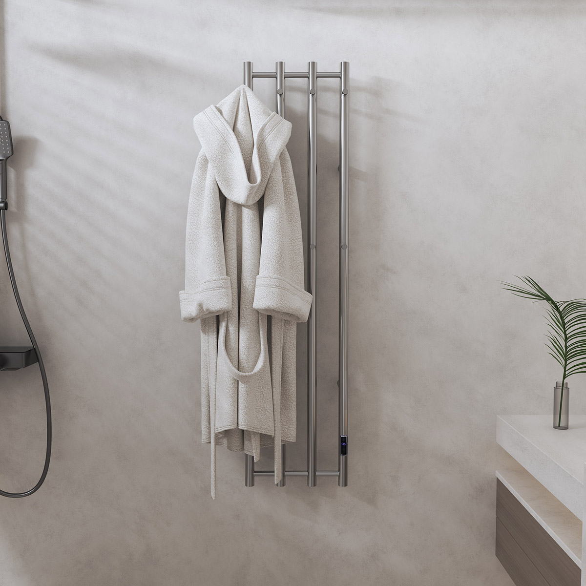 4桿時控開關電熱毛巾架 4 bar time switch heated towel rai 材質Material:SS201/SS304 功率Power:220V/250W 表面Surface:Mirror Polished 鏡面拋光 尺寸Size:345*123*1405mm 包裝Ctn size:402*106*1470mm