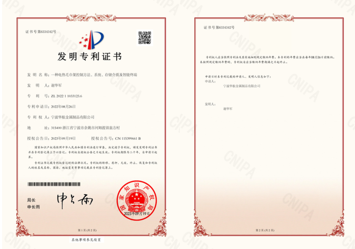 作為一家高新技術(shù)企業(yè),公司始終以“質(zhì)量求生存,創(chuàng)新促發(fā)展”為宗旨,積極開展各項(xiàng)創(chuàng)新工作。截至目前,公司累計(jì)已申請并獲得國家知識產(chǎn)權(quán)局發(fā)明專利,實(shí)用新型專利及外觀設(shè)計(jì)專利等60余項(xiàng)。這些專利成果,意味著寧波華航在電熱毛巾架領(lǐng)域的創(chuàng)新成果得到認(rèn)可,為公司增強(qiáng)技術(shù)核心競爭力,和公司的再發(fā)展提供了強(qiáng)有力的科技支撐
